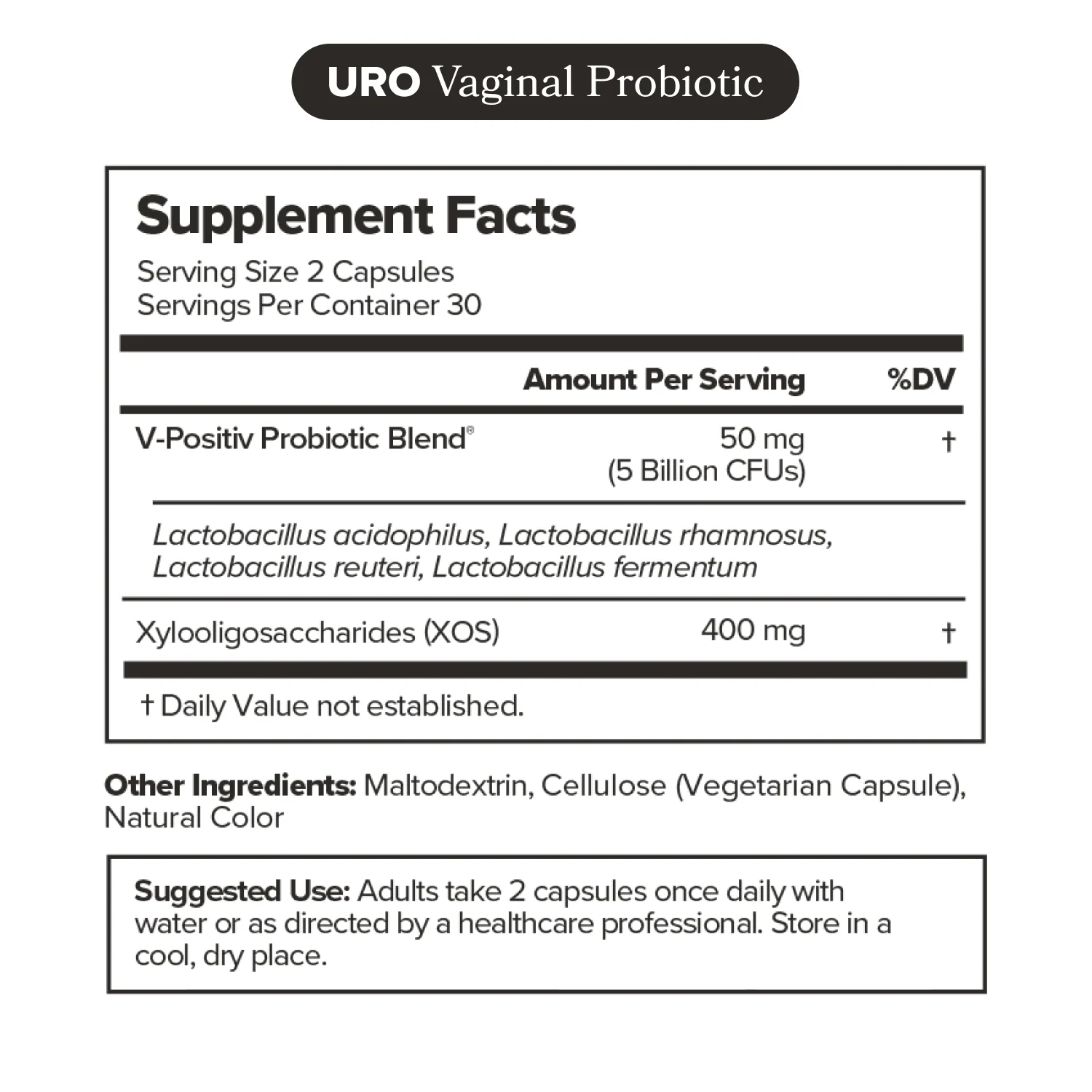 URO Vaginal Probiotic is a natural, proprietary vaginal health synbiotic supplement (which means it contains both prebiotics & probiotics) formulated to support healthy vaginal pH, odor, and flora.