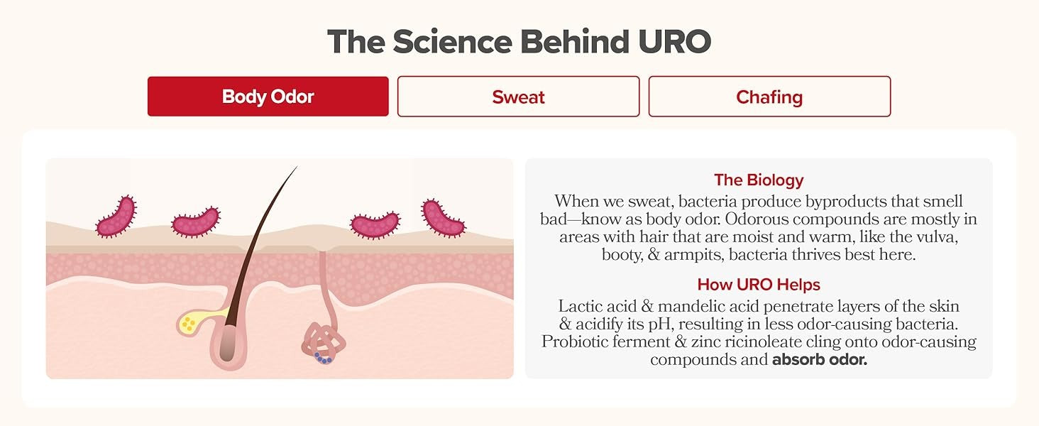 • URO Intimate Deodorant is a clinically-tested cream that can be applied daily to help proactively neutralize odors caused by bacteria interacting with moisture on the skin.